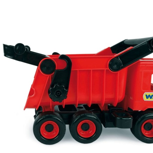 Duża i wytrzymała wywrotka w kolorze czerwonym, z podnoszoną skrzynię ładunkową oraz otwieraną klapę. Pojazd ma z przodu zaczep.