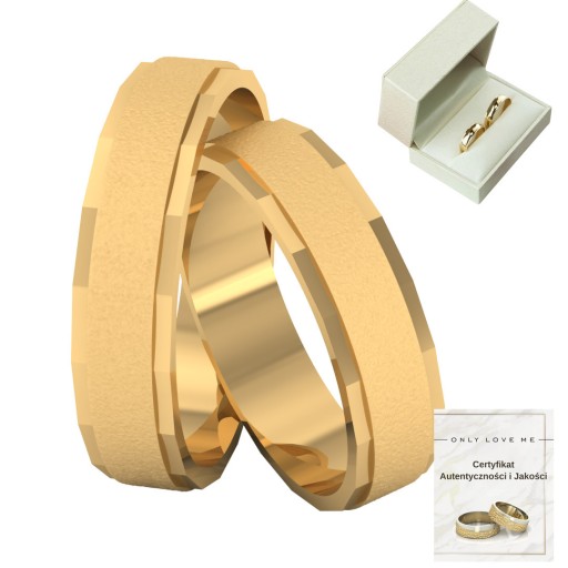 Obrączki wykonane są z najwyższej próby srebra 925, które pokryte zostało 23 karatowym złotem, dzięki czemu do złudzenia przypominają obrączki wykonane w całości ze złota. Powłoka złocenia wynosi aż 2 mikrony i dodatkowo została zabezpieczona bezbarwną warstwą ochronną. Taka metoda wykonania zapewnia wysoką trwałość. Powierzchnia obrączek jest fakturowana, co nadaje im eleganckiego, satynowego połysku. Dodatkowe szlify po bokach frezem diamentowym podkreślają piękny blask złota i ozdabiają obrączkę. To idealny model dla osób ceniących sobie nowoczesność, minimalizm i interesujący design. Gwarantujemy zadowolenie z tego egzemplarza, który cieszy się niesłabnącą popularnością.