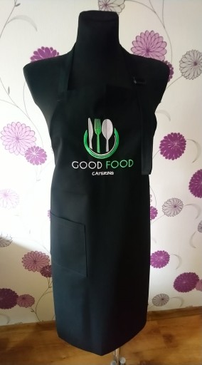Fartuchy kuchenne szyte w Polsce z wysokiej jakości tkaniny, posiadają kieszeń i regulowany pasek na szyi.