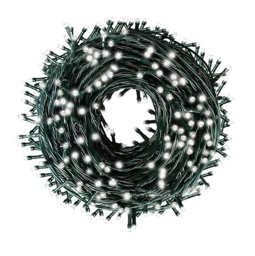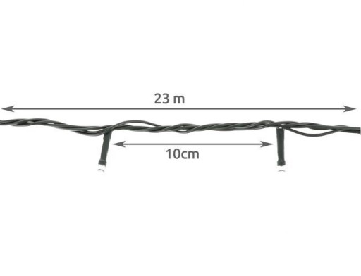 - SPECYFIKACJA – ilość trybów: 8; rodzaj oświetlenia; LED; sterownik: tak; barwa światła: zimny biały; ilość diod LED: 200; klasa wodoodporności: IP44; zasilanie: sieć energetyczna; moc: 2W; napięcie: 230V / 31V; długość całkowita: 23m; waga: 0,35kg; waga w opakowaniu: 0,4kg.