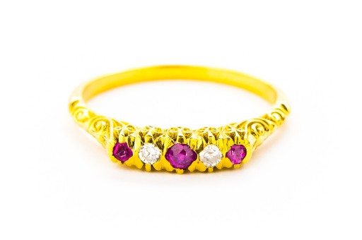 STARY, ZŁOTY PIERŚCIONEK Z DIAMENTAMI I RUBINAMI