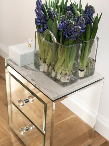 Półka została wykonana także z lustra kryształowego i zamocowana 14 cm nad posadzką. Mocowanie półki jest solidne i stabilne, bo również na stelażu chrom. Poprzeczne wzmocnienia, na których płożona jest półka, są bardziej dyskretne, i stelaż ma wymiary 3,5 cm x 3,5 cm. Dodatkowo półka posiada prosty system, który ogranicza jej przesuwanie i stabilizuje na miejscu, dając pewność, że się nie zsunie. Stelaż konsoli i półka do samodzielnego montażu. Do mebla dołączony jest druk z wytycznymi do złożenia lustrzanej konsolki. Montaż jest bardzo prosty, a klienci nie mają z nim najmniejszych problemów. Wystarczy jedynie wkręcić nogi, które mają już przymocowane odpowiednie końcówki, aby można było w dalszym etapie nasadzić poprzeczki i położyć na nich półkę.