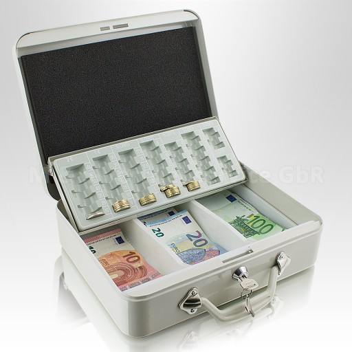 Ta wygodna kasetka na pieniądze jest idealnym miejscem na sortowanie i liczenie pieniędzy / monet.Dzięki zintegrowanym gniazdom we wkładzie monet masz szybki dostęp do monet o różnych wartościach - bez przeszukiwania. W dolnym obszarze jest bardzo dużo miejsca na np. za banknoty, pokwitowania, monety, bilety - nawet małe znaczki znajdą teraz swoje miejsce.