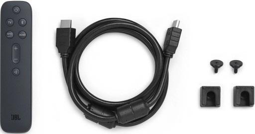 Zakupując soundbar JBL Bar 2.1 Deep Bass, otrzymujesz urządzenie podstawowe, zestaw montażowy, pilota, kabel HDMI, kabel zasilający oraz baterie.