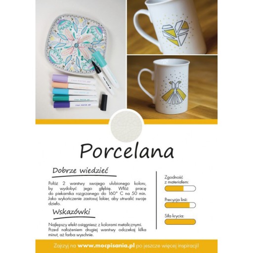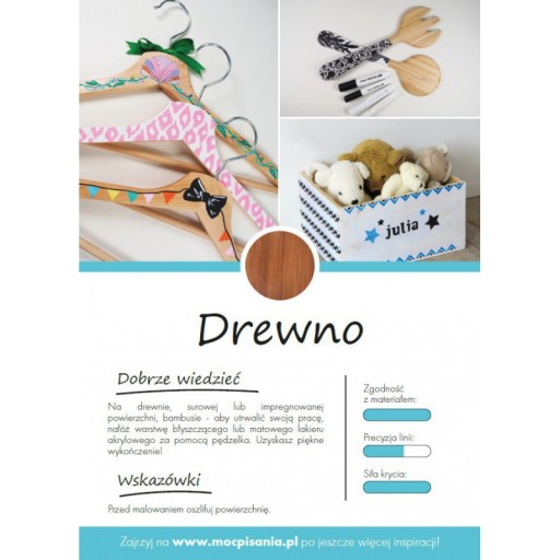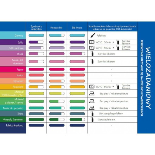 Nie tylko idealnie sprawdzi się przy malowaniu na papierze ale także idealnie współgra z drewnem, szkłem, plastikiem, styropianem, porcelaną, tablicami kredowymi oraz różnego rodzaju materiałami.