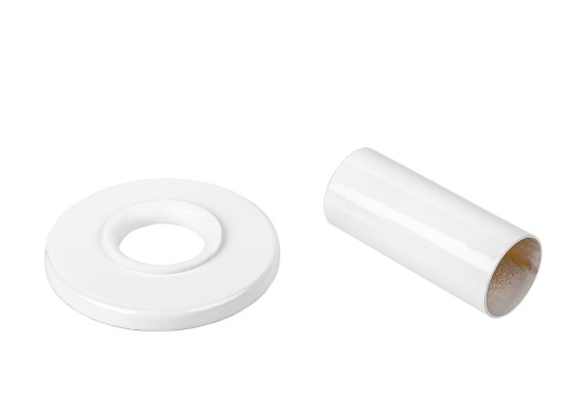 Wysokiej jakości zestaw maskujący składający się z rozety pojedyńczej i tuleje przeznaczone do montażu zestawów termostatycznych i zaworów grzejnikowych (do rur 16 PEX oraz 15 Cu).