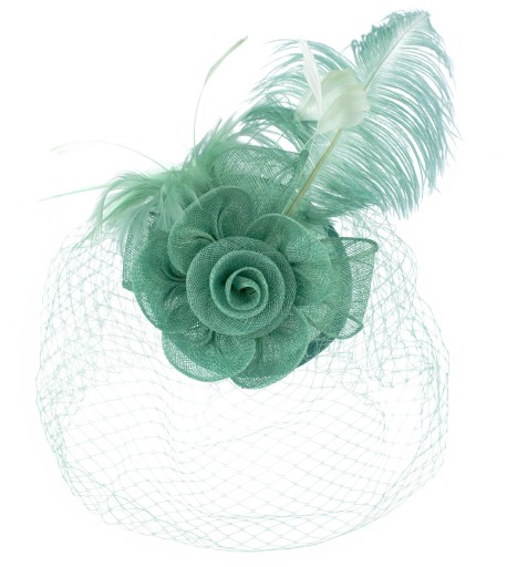 Ozdobiony fantazyjnym kwiatem,piórami i woalką.