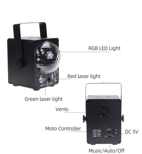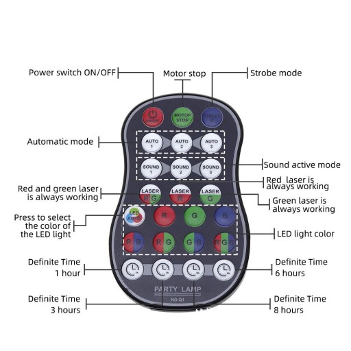 Pilot może być włączany/wyłączany, regulacja światła LED i lasera, może przełączać się między 3 trybami pracy i 3 trybami muzycznymi.