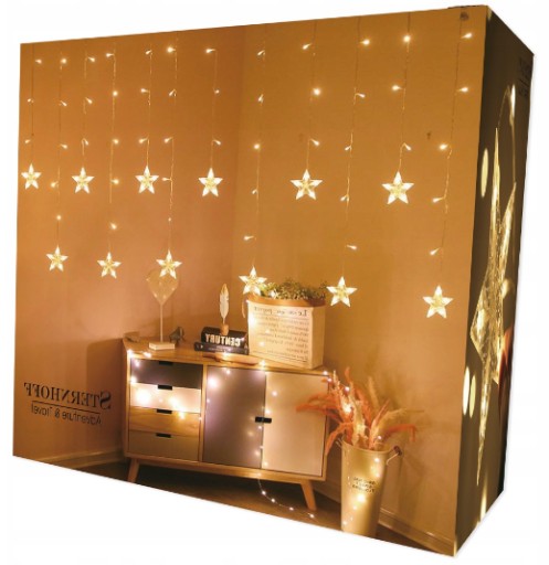 Zasłony świetlne gwiazdki są bardzo starannie wykonane. Rozproszone naprzemiennie w równych odstępach gwiazdy LED o dwóch wielkościach tworzą pełną wdzięku kompozycję. Miedziane druciki, utrzymujące gwiazdki, zostały wzmocnione przez spiralną budowę i posiadają wzdłuż długości pojedyncze lampeczki. Druciki wykonane zostały z miedzi, co dodaje zestawowi dodatkowego uroku. Rozpiętość kurtyny pozwoli na swobodne dopasowanie i zawieszenie jej do karnisza, dzięki czemu gwiazdki, wkomponowane np. w mleczną, lekko prześwitującą firanę, będą stanowić efektowne dopełnienie wystroju okien. A to dopiero jedno z wielu zastosowań, jakie posiadają prezentowane lampki gwiazdki.