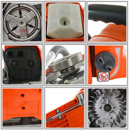 - Automatyczny system smarowania łańcucha: Ze względu na to, że łańcuch jest automatycznie smarowany przez specjalny system nie musimy robić tego ręcznie Takie rozwiązanie pozwala nam zaoszczędzić dużo czasu, gdyż piła nie wymaga specjalistycznej konserwacji.