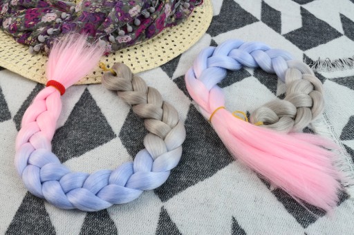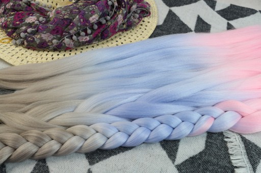 Włosy syntetyczne w przepięknym wariancie kolorystycznym - szaro-niebiesko-różowym. Wykonane z gładkiego i przyjemnego w dotyku henlonu.