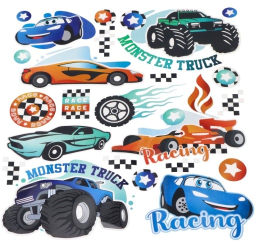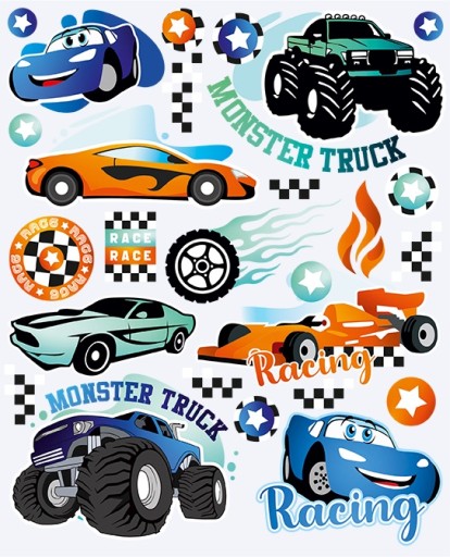 Na arkuszu oprócz Monster Truck'ów znajdziecie także samochody wyścigowe, opony z płomieniami oraz napisy w stylu "Race" a także skrawki w stylu flagi szachownicy wyścigowej. Całość w barwnej kolorystyce, zdecydowanie bardziej polecana dla chłopców, jeśli jednak młode Panie również interesują się motoryzacją to z pewnością przypasują im te naprasowanki.