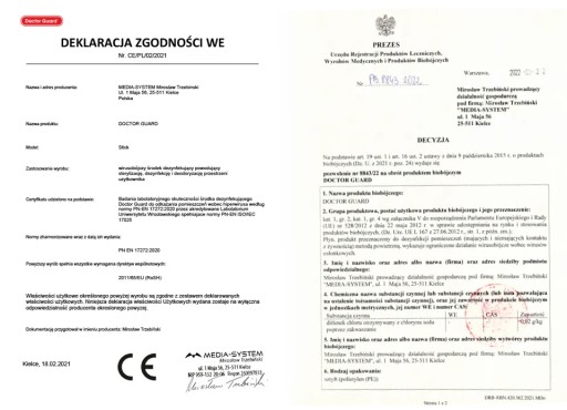 Doctor Guard został dopuszczony do kontaktu również z żywnością przez Urząd Rejestracji Produktów Leczniczych, Wyrobów Medycznych i Produktów Biobójczych pod numerem: PB.8843.2022