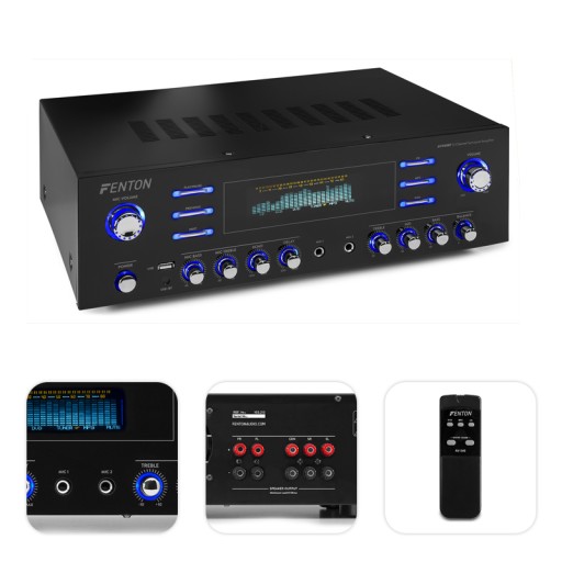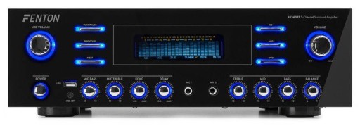 Fenton AV340BT to 5-kanałowy wzmacniacz surround o łącznej mocy 510W. Wzmacniacz wyposażony jest w Bluetooth, odtwarzacz MP3 na USB i oczywiście kilka wejść. Jeśli lubisz śpiewać lub robić karaoke, Fenton AV340BT jest również doskonałym wyborem ze względu na dwa wejścia mikrofonowe. Wzmacniacz wyposażono również w dynamiczny wyświetlacz z niebieskim podświetleniem. Niewidoczne, ale obecne, to wymuszone chłodzenie i ochrona przed zwarciem.