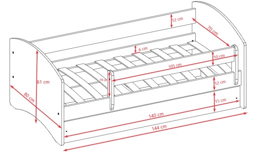 Meble dziecięce tworzone z pasją i niezwykłą starannością, aby było wygodne, praktyczne i przede wszystkim bezpieczne!! Nasze łóżko dla dziecka nie ma ostrych krawędzi, dzięki czemu nie należy obawiać się o to, że dziecko pozostawione w łóżku czy jego okolicy może zrobić sobie krzywdę. Na zaokrąglonych krawędziach, dodatkowo zastosowany jest miękki profil przypominający gumę, żeby zapewnić maksimum bezpieczeństwa. Kręcenie się, wiercenie to częste zjawisko, a do tego zrzucanie kołdry i poduszki -znamy to i mamy na to sposób dlatego zamontowana została barierka ochronna, która również zapobiega upadkowi dziecka, dzięki czemu, nasza pociecha i my- rodzice, możemy spać spokojnie, a nie czuwać. Barierka o długości 105cm jest ruchoma, możemy ustawić ją na krawędzi łóżka bezpośrednio przy wezgłowiu(jak na rysunku), na środku albo w nogach.