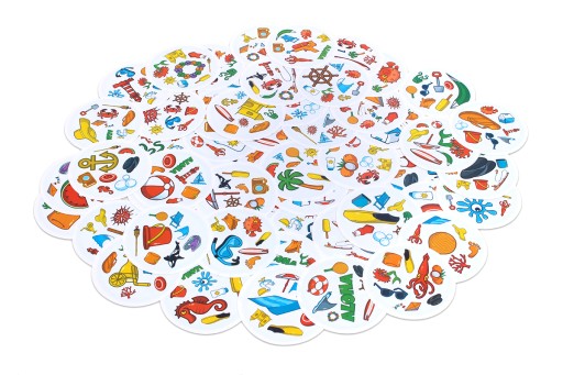 Dobble wodoodporne to 55 kart, na których znajdziecie po 8 symboli związanych z morzem i plażą. Na 2 dowolnych kartach zawsze znajduje się dokładnie 1 wspólny symbol. Niezależnie od tego, czy grasz w pubie, nad jeziorem, na basenie czy w wannie, Twoim celem jest jak najszybciej odnaleźć wspólny symbol i wygrać!