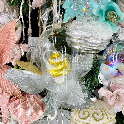 4️⃣ Kolor: Przezroczysta patera z żółtą muffinką zdobioną brokatem.