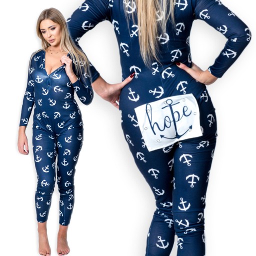Piżama BOSTI z otwieraną klapką otwieraną na metalowe napy na wysokości pośladków. Przyjemny materiał zarówno na zimę jak i lato. Rozpinany dekolt.