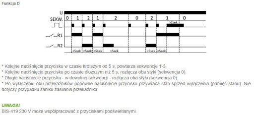 Zasilanie przekaźnika sygnalizowane jest świeceniem LED zielonej U. Przekaźnik sekwencyjny posiada dwa oddzielne wyjścia R1 i R2. Stan styków (zamknięty/otwarty) wymuszany jest sekwencyjnie zgodnie z zadanym programem. Przełączenie styków w kolejny stan następuje po kolejnym impulsie przycisku sterującego. Załączenie styku R1 i R2 sygnalizowane jest świeceniem odpowiednich LED czerwonych R1 i R2. Po zaniku napięcia zasilania stan styków jest resetowany. Po ponownym powrocie napięcia zasilania przekaźnik rozpoczyna pracę od sekwencji nr 0.