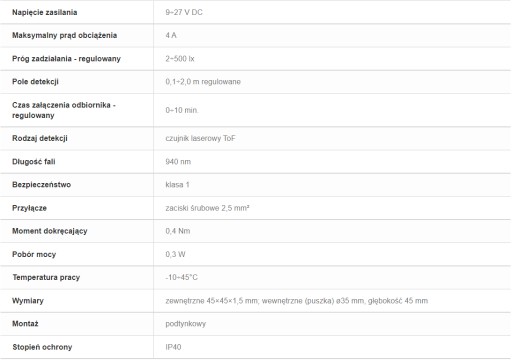 - zakres detekcji ustawiany płynnie w przedziale od 0,1 do 2 m;