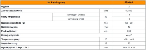 na 2 wyjściach 4-10dB (50862MHz), 5dB (862-2400MHz)