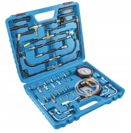 Tester przeznaczony do diagnostyki cisnienia wtrysku paliwa w silnikach benzynowych. Profesjonalny zestaw składajacy sie z manometru z wezykiem oraz kompletu elementów. Czytelna skala manometru ułatwia odczytywanie wyniku pomiaru. Wskaznik wykonany jest z odpornych na uszkodzenia, a przy tym lekkich materiałów. Dodatkowo szybka wskaznika obudowana jest gumowa osłona absorbujaca wstrzasy. Stosowany głównie w serwisach motoryzacyjnych.