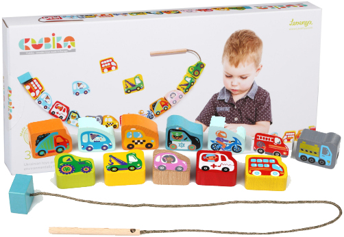Zestaw składa się z 12 części i sznurka z drewnianą końcówką i ogranicznikiem. Nawlekanie to jedna z najlepszych zabaw służąca rozwojowi umiejętności motorycznych. CUBIKA oferuje nam bardzo estetyczną wersję tego nawlekania w postaci zestawu samochodzików. Elementy wykonane są z wysokiej jakości jesionu i drewna bukowego, a po malowaniu używa się specjalnej farby na bazie wody, która jest bezpieczna dla dzieci i bezzapachowa.