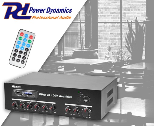 Power Dynamics PBA120 to potężny wzmacniacz 100V o mocy 120W. Jest wyposażony w odtwarzacz MP3, tuner, Bluetooth oraz wiele wejść liniowych i mikrofonowych, dzięki czemu prawie wszystkie źródła dźwięku mogą być używane z tym wzmacniaczem. W celu prawidłowego dostrojenia dźwięku jest wyposażony w regulację basów i tonów wysokich, a każde wejście ma własną regulację głośności.