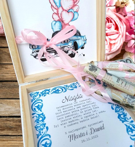 - wewnątrz różowe tasiemki do przewiązania banknotów ( 6 sztuk)