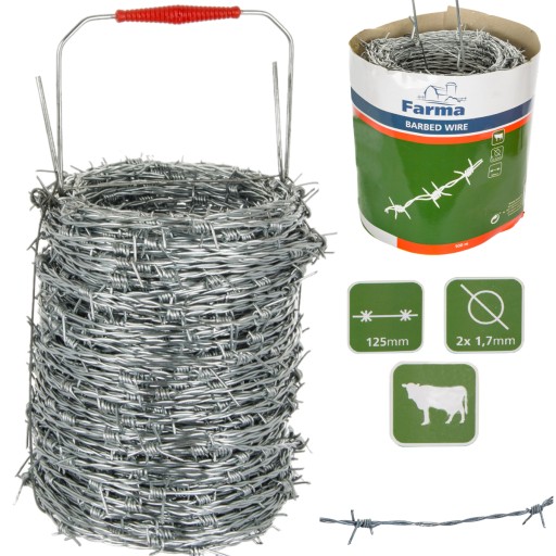 Drut kolczasty o długości 100m w rolce z wygodnym uchwytem do przenoszenia.