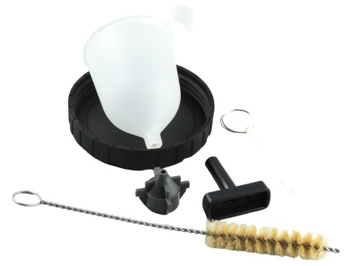 - Pistolet posiada również regulację przepływu dyszy, zdejmowaną głowicę, dwie dysze w komplecie, gumowaną rękojeść, praktyczny zaczep i serię akcesoriów ułatwiających czyszczenie i poprawiających komfort pracy (min. pojemnik do badania lepkości, szczotkę i igłę do czyszczenia dyszy, zakrętkę do pojemnika z cieczą).