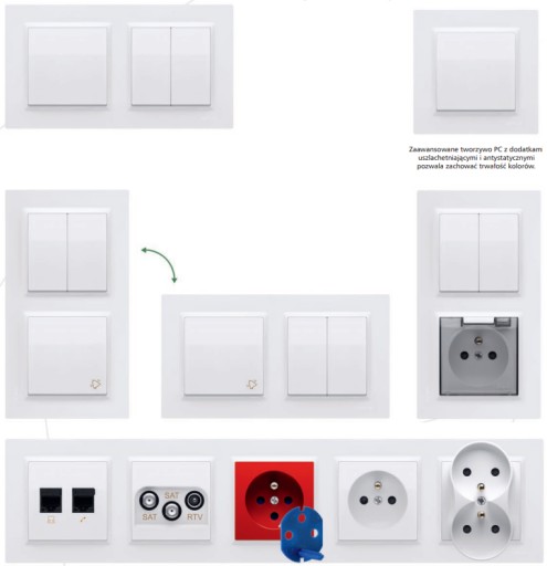 Simon 10 to seria, którą najchętniej wybierają deweloperzy pod duże inwestycje. Z racji na swoją cenę i doskonałą jakość wykonania, nie pogardzą nią też klienci indywidualni. W naszym sklepie internetowym występuje w kolorze białym. Charakterystycznym elementem dla serii Simon 10 jest nieprzewodzący mostek, który zapewnia bezpieczeństwo oraz elastyczność podczas prac montażowych.
