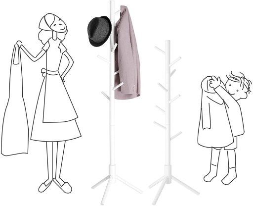 Czy wieszak na płaszcze zawsze się przewraca, gdy chcesz powiesić na nim kurtkę? Uciążliwy problem, prawda? Wypróbuj ten stojak na ubrania z litego drewna! Wykonany z drążka o grubości 3,8 cm i trójnożnej podstawy o średnicy 47 cm, charakteryzuje się doskonałą stabilnością niczym drzewo. Bez chaosu, bez irytacji: ubrania na krześle, torby na podłodze, czapki w szafie – to wszystko można zawiesić na tych 8 haczykach. Dzięki zaokrąglonym końcom nie musisz się martwić o to, że podczas wieszania ubrań zaciągniesz strukturę tkaniny. Każdy hak ma nośność do 5 kg. Dzięki swej uniwersalności i bieli wieszak pasuje do każdego wnętrza.