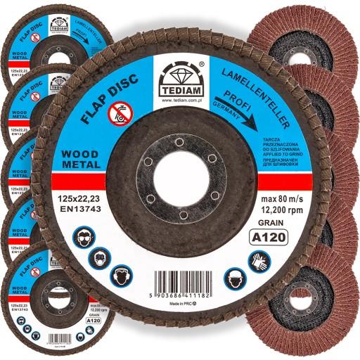 Ściernice lamelkowe marki TEDIAM® Germany design do szlifierek ręcznych cechuje wysoka jakość wykonania listków z materiału ściernego oraz trwałość. Tarcze TEDIAM typu listkowego bardzo dobrze sprawdzą się w pracy z takimi materiałami jak metale, drewno. Dostępność tarcz w kilku stopniach granulacji (40 – gruboziarnista, 60 – średnioziarnista, 80 – drobnoziarnista, 100 - drobnoziarnista, 120 - drobnoziarnista) umożliwia zastosowanie ich na każdym etapie obróbki.