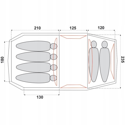 - Namiot posiada dwie oddzielne sypialnie. W obu sypialniach znajdują się praktyczne kieszenie i zaczepy ułatwiające zachowanie porządku wewnątrz namiotu. Istnieje możliwość powiększenia powierzchni przedsionka przez odczepienie mniejszej sypialni od namiotu. Obie sypialnie posiadają w wejściach moskitiery,