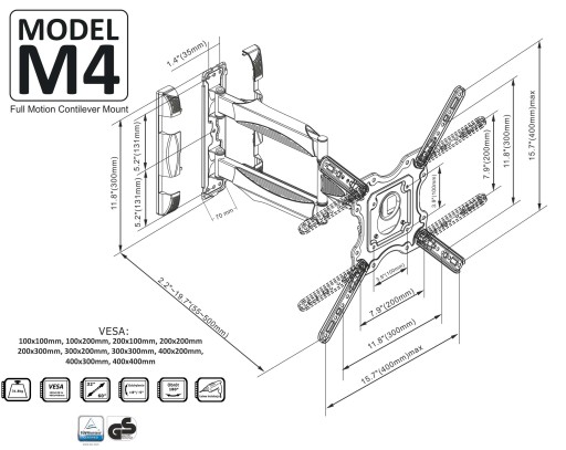 - uchwyt skonstruowany na otwory kompatybilne do telewizora standard VESA 100x100, 100x200, 200x100, 200x200, 200x300, 300x200, 300x300, 400x200, 400x300, 400x400