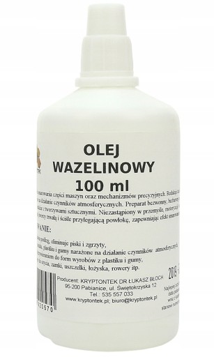 Olej wazelinowy smaruje i konserwuje maszyny do szycia i dziewiarskie, zamki i zawiasy, kłódki, narzędzia pomiarowe, sprzęt sportowy oraz inne mechanizmy precyzyjne.