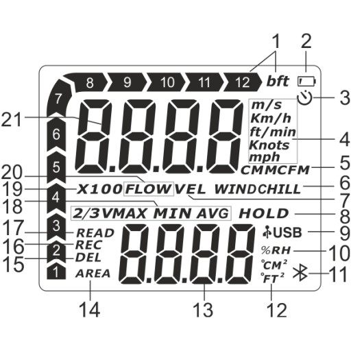 - Rozdzielczość: 0.1 (m/s) / 1.968(Ft/min) / 0.019 (Węzły) / 0.036 (Km/h) / 0.022 (Mph)