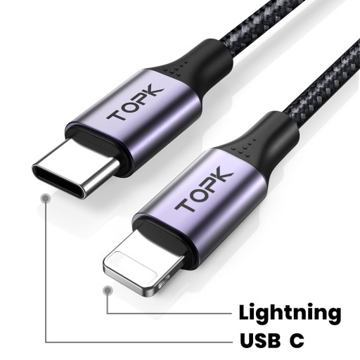 Kabel TOPK AP10 złącze USB C - Lightning (iPhone) długość 50cm (0,5m) , 20W , nylonowy oplot, wzmacniany, szybkie ładowanie, bardzo trwały , elastyczny