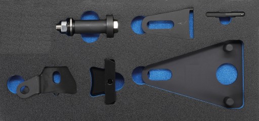 Zestaw narzędzi z zastosowaniem do blokowania koła zamachowego i przedniego koła pasowego przy silnikach z podwójnym wałkiem rozrządu napędzanych na łańcuch.