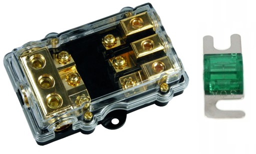 Blok rozdzielczy z powierzchniami stykowymi pozłacanymi 24-karatowym złotem na 3 mini bezpieczniki listwowe ANL do 80 amperów każdy do rozdzielania kabli zasilających. 3 wejścia do 25mm2 i trzy do 16mm2. Niezwykle niska odporność dzięki dużym pozłacanym powierzchniom styku.
