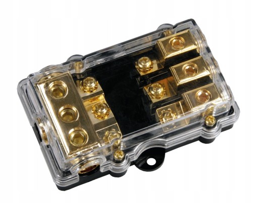 Blok rozdzielczy z powierzchniami stykowymi pozłacanymi 24-karatowym złotem na 3 mini bezpieczniki listwowe ANL do 80 amperów każdy do rozdzielania kabli zasilających. 3 wejścia do 25mm2 i trzy do 16mm2. Niezwykle niska odporność dzięki dużym pozłacanym powierzchniom styku.
