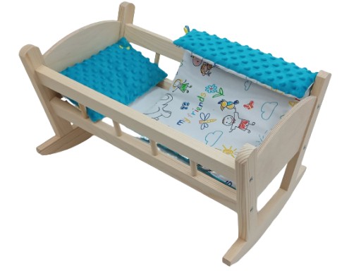 Urocza kołyska drewniana dla lalek, wykonana z drewna świerkowego.
