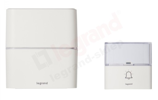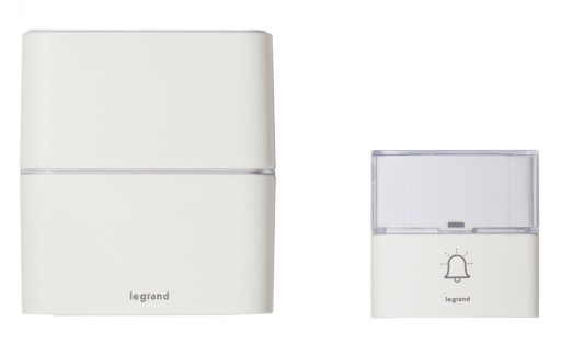 Zestaw zawiera prostokątny dzwonek (odbiornik) i prostokątny przycisk IP54 (nadajnik) z okienkiem opisowym.