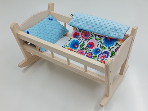 Urocza kołyska drewniana dla lalek, wykonana z drewna świerkowego.