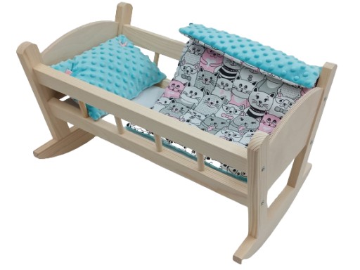 Urocza kołyska drewniana dla lalek, wykonana z drewna świerkowego.