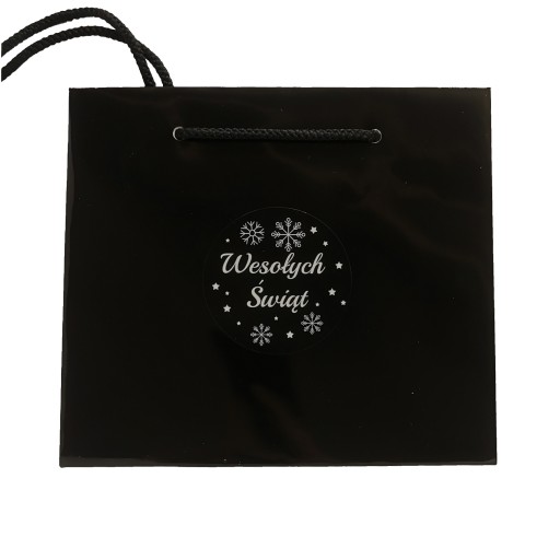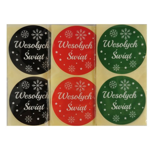 Paczka zawiera 5 sztuk okrągłych naklejek w kolorze czarnym z motywem gwiazdek i napisem "Wesołych Świąt".