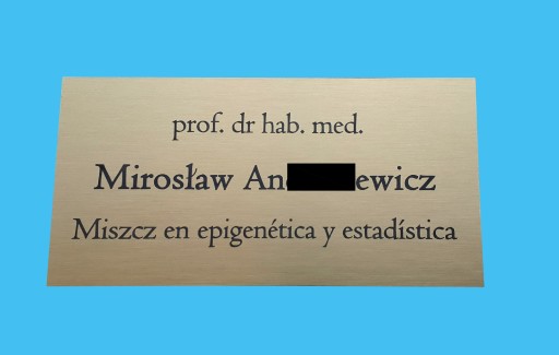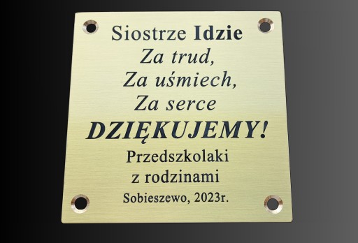 Tabliczka wykonana z mosiądzu grawerskiego szczotkowanego (kolor złoty) fabrycznie zabezpieczona lakierem bezbarwnym do zastosowań wewnętrznych i zewnętrznych. Grawer wykonany techniką graweru wklęsłego, grawer patynowany na kolor czarny. Wymiary tabliczki 200 x 100 mm. Tabliczka posiada dwustronną bardzo mocną taśmę piankową do montażu na zewnątrz. Na życzenia klienta wykonuję otwory do przykręcenia za pomocą mosiężnych wkrętów (wkręty w cenie tabliczki). Istnieje możliwość wykonania tabliczek o innych wymiarach, wtedy cena ustalana jest indywidualnie.
