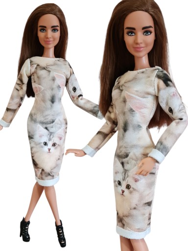 Przedmiotem sprzedaży jest dłuższa dopasowana sukienka. Uszyta z dzianiny dresowej w druku cyfrowym w kociaki. Zapięcie na delikatny rzep.
