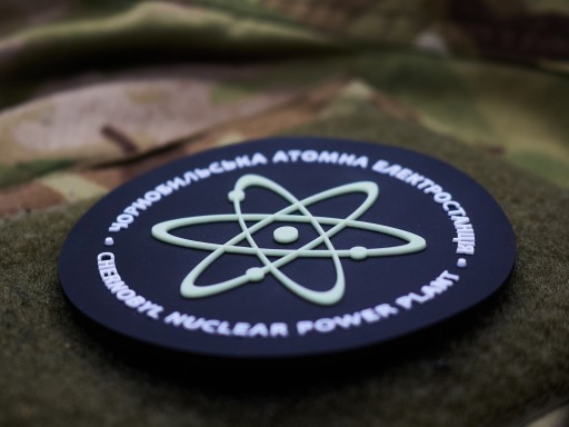 Świecąca w ciemności okrągła naszywka z napisem "Czarnobylska Elektrownia Jądrowa" w językach ukraińskim oraz angielskim. W centralnym punkcie znajduje się symbol atomu, który świeci w ciemności po krótkim naświetleniu.